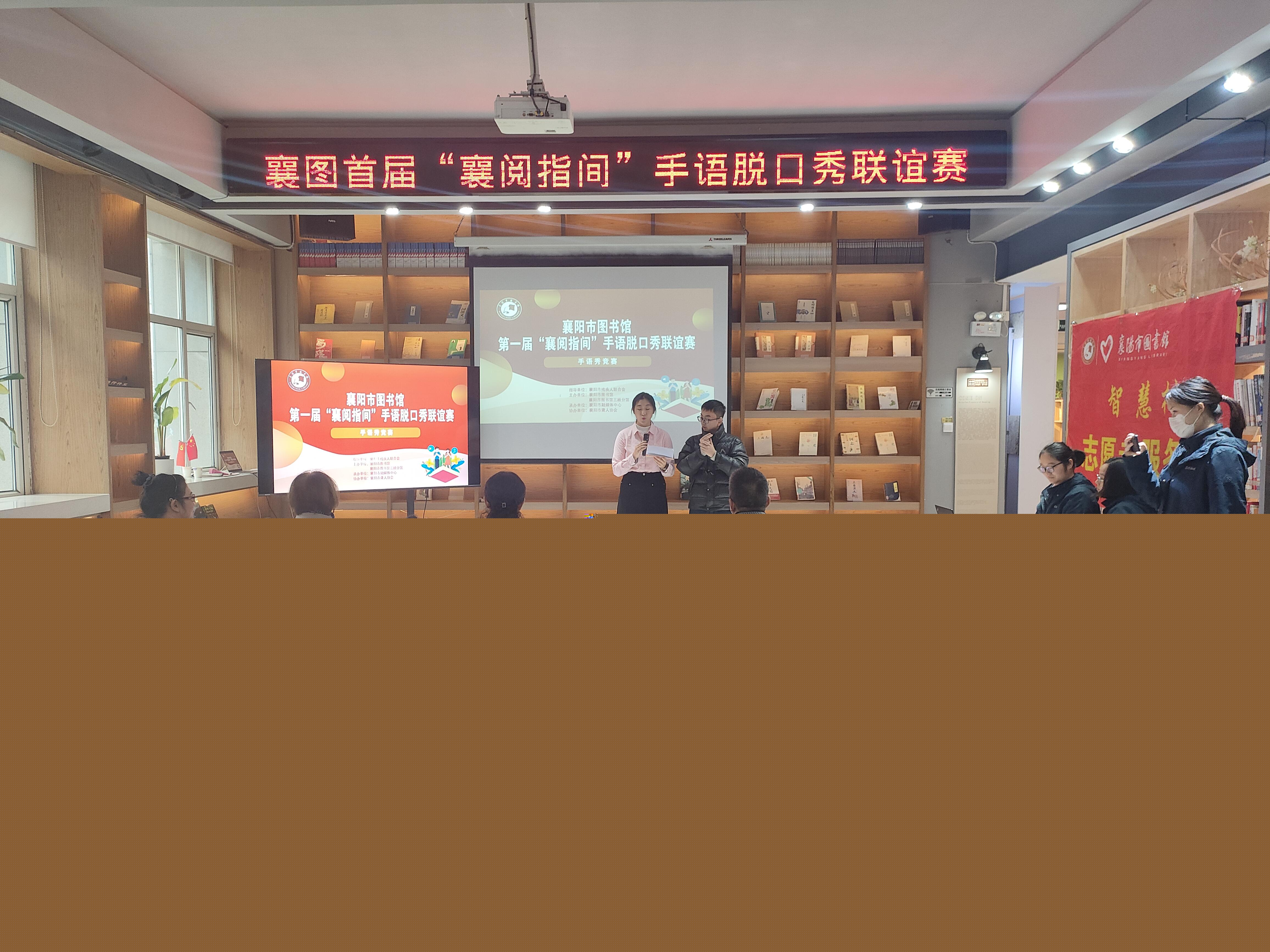 注:值得注意的是,10月26日上午,襄阳市图书馆将在东津民发广场举办首届手语脱口秀《向月之见》暨文化市场活动《开图书馆》。届时,优秀的手语作品将走出图书馆,走进公共空间,与市民面对面互动,继续弘扬无障碍文化,助力人类文明进步。构建更加包容、融合的社会环境。