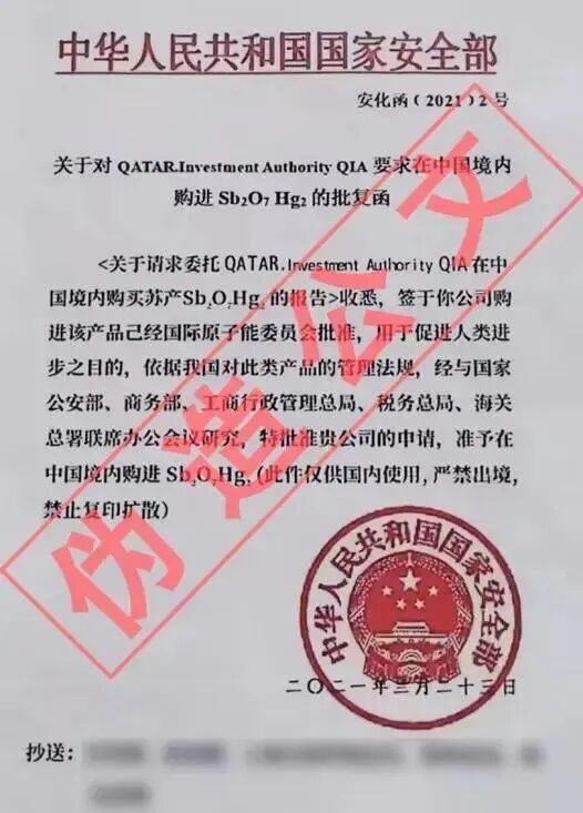犯罪分子还引用了互联网上流传的政府官方文件“模板”,并伪造了国家安全部和其他机构的红发文件,其中包括“国家安全部每年都会批准红汞交易”。谎称 Mercurocromo 的购买是经过授权的,将经济欺诈描述为“经过正式授权的大规模国际交易”,并编造了“授权转售”的故事。欺骗受害人的信任。
