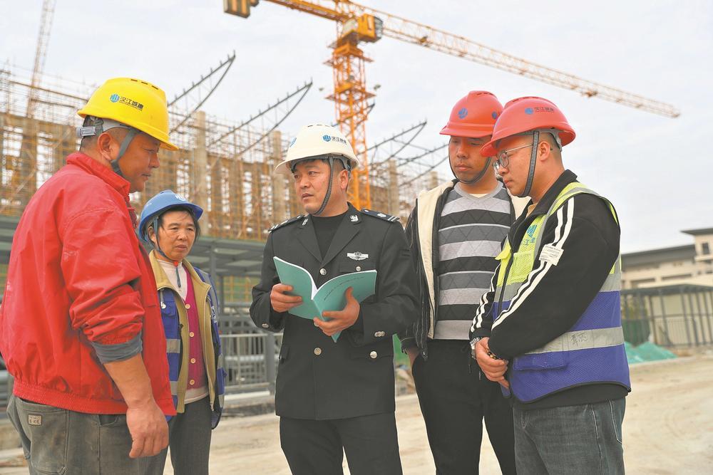 11月11日,襄阳市安全生产维权中心负责人到东金新区一建筑工地检查“六项制度”落实情况,宣传农民工维权意识。
